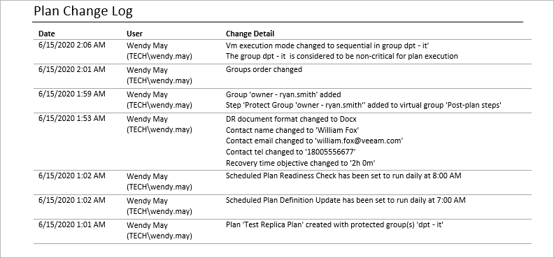 The Plan Change Log section will show plan configuration edits. It allows you to track who changed plan settings, when and what was changed.