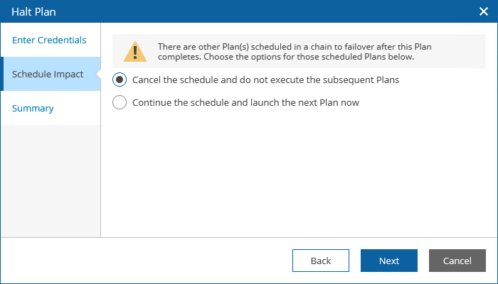 At the Schedule Impact steps, choose whether you want to proceed to or cancel execution of subsequent plans after the current plan enters the HALTED state.