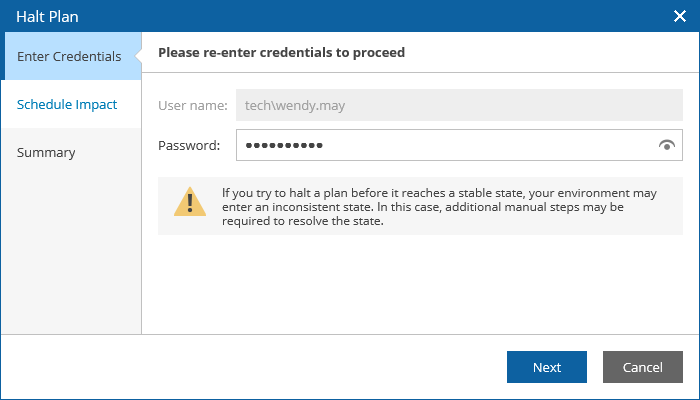 The Halt action interrupts plan execution. Currently executing steps will be completed, then the plan will enter the HALTED state. To learn how to work with HALTED restore plans, see Managing Halted Plans.