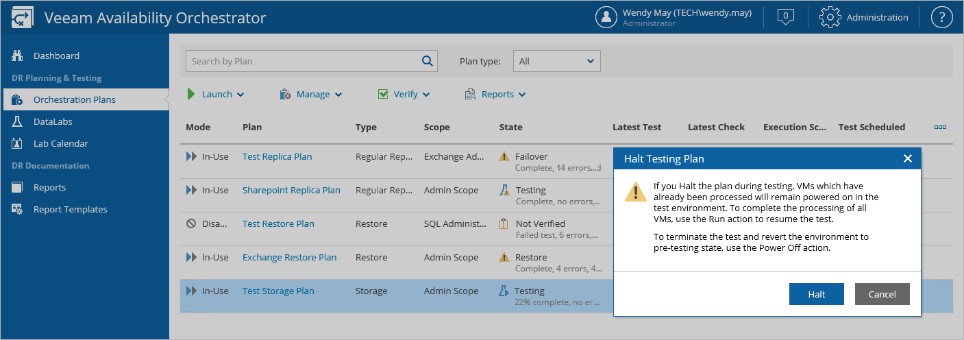 The Halt action interrupts plan testing. You may need to halt plan testing, for example, if you need to fix some environment-related issues and then proceed with testing later (in this case, recovered VMs will still continue to run). Or you may need to stop the testing process completely, for example, if you no longer need to test the selected storage plan (in this case, recovered VMs will be deleted).