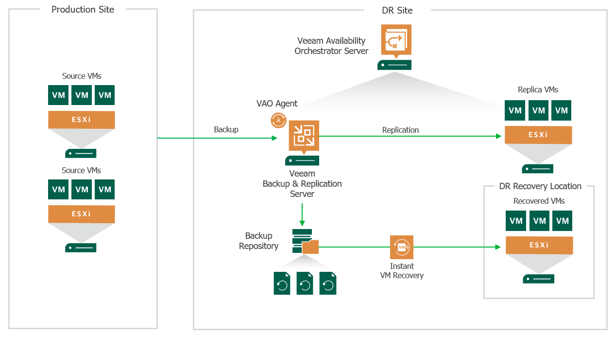 In this scenario, the VAO server that provides plan management, testing and execution is deployed in the DR site, along with the Veeam Backup & Replication server that protects your production workloads and the backup repository that stores backup files.