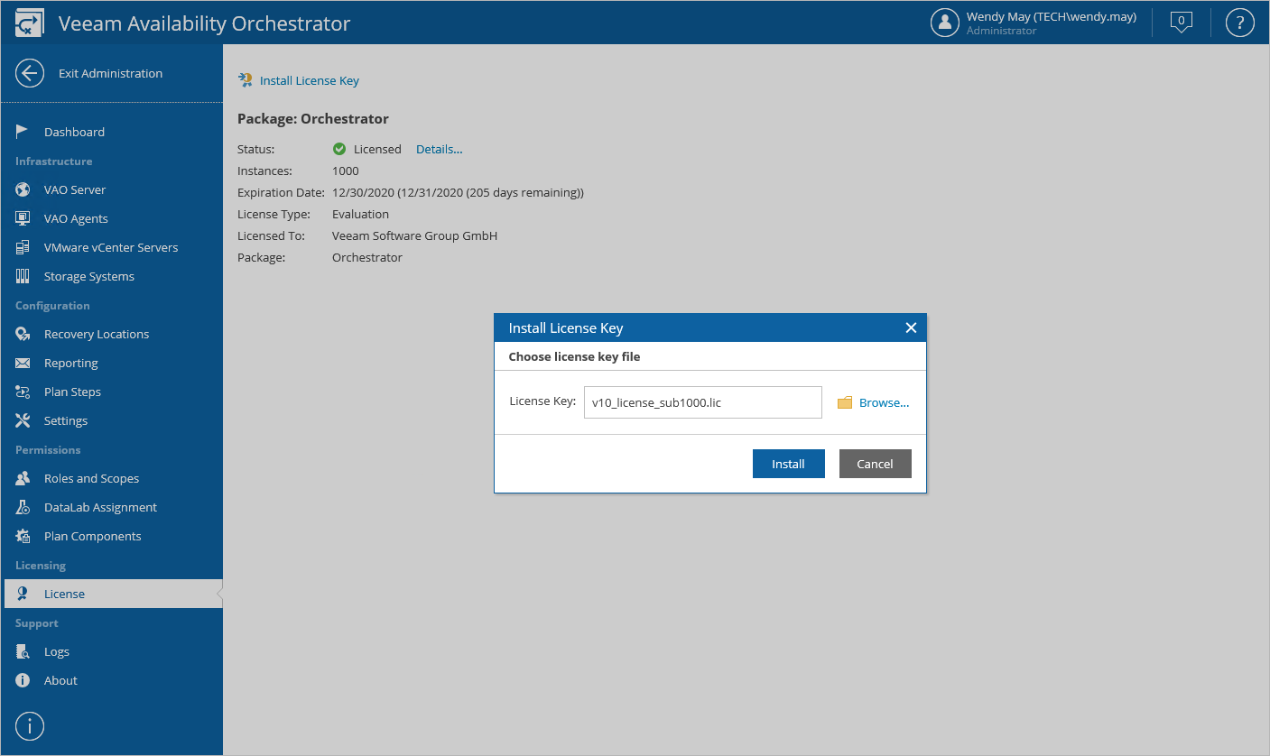 - In the Install License Key window, click Browse to browse to a license file, and then click Install.