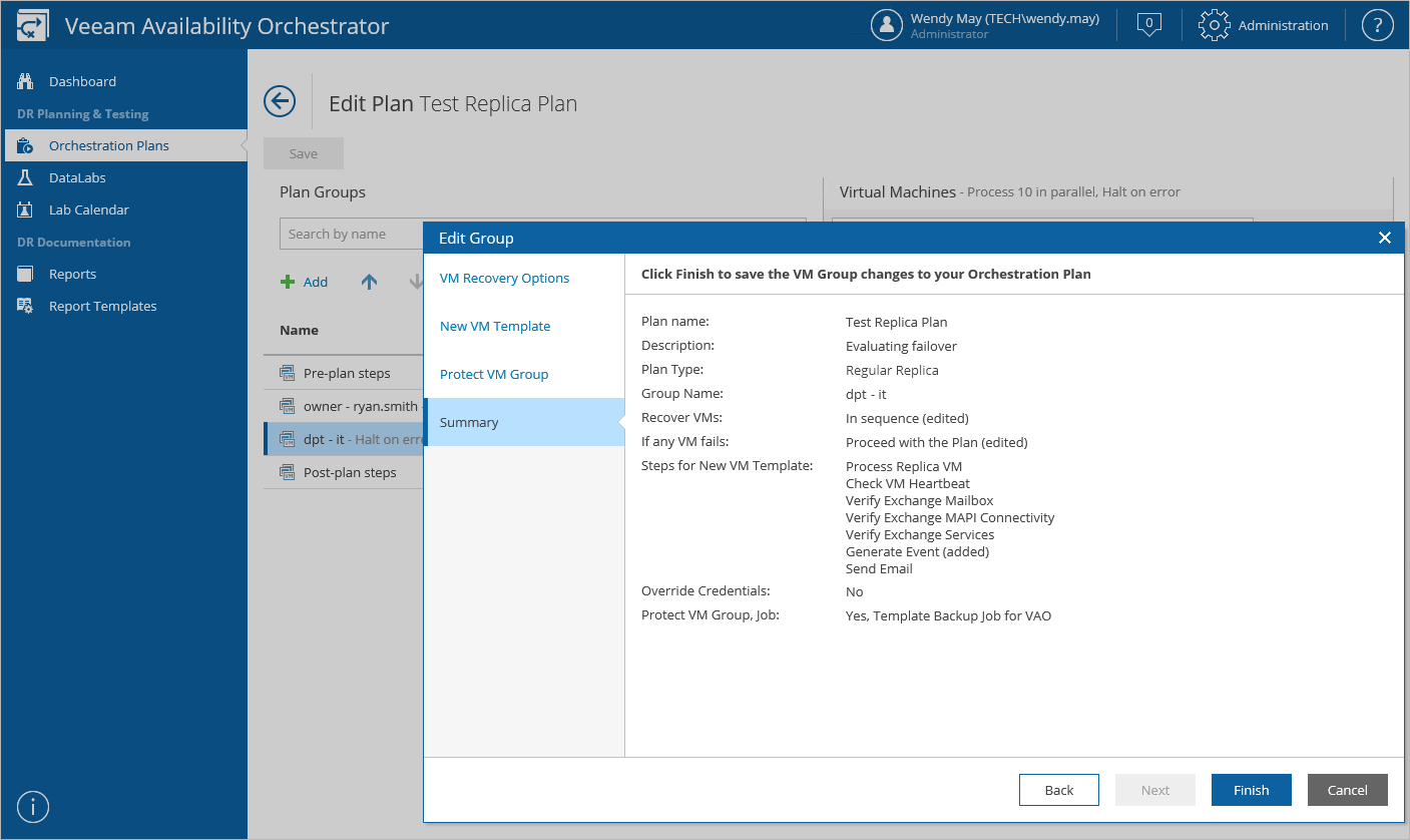 - [This step applies only to regular replica and restore plans] To choose VM protection options for the VM group, follow the instructions provided in section Creating Regular Replica Plans (step 7) or Creating Restore Plans (step 8).