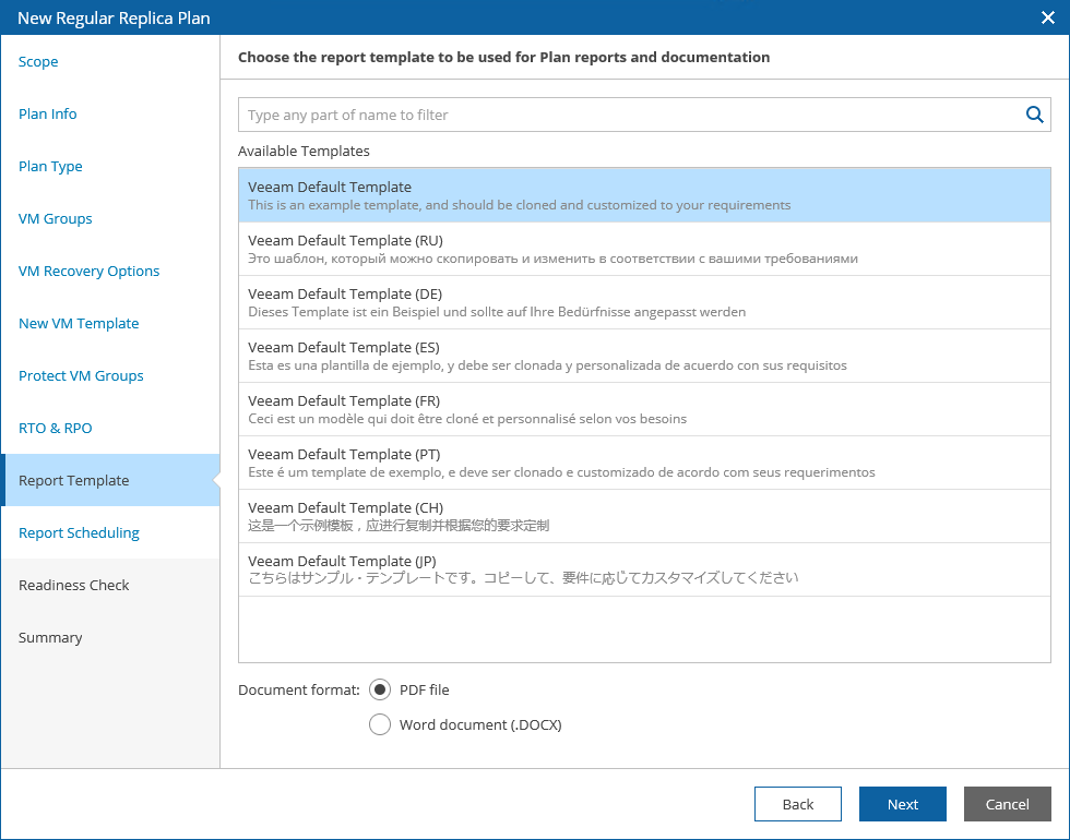 At the Report Template step of the wizard, select a document template that will be used to create documents for the plan. Use options in the Document format list to choose whether you want to generate documents in the DOCX or PDF format.