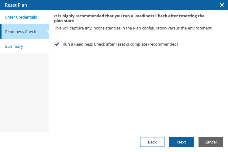 - At the Readiness Check step, select the Run a Readiness Check after reset is complete check box to run a readiness check to confirm that the changes are valid.