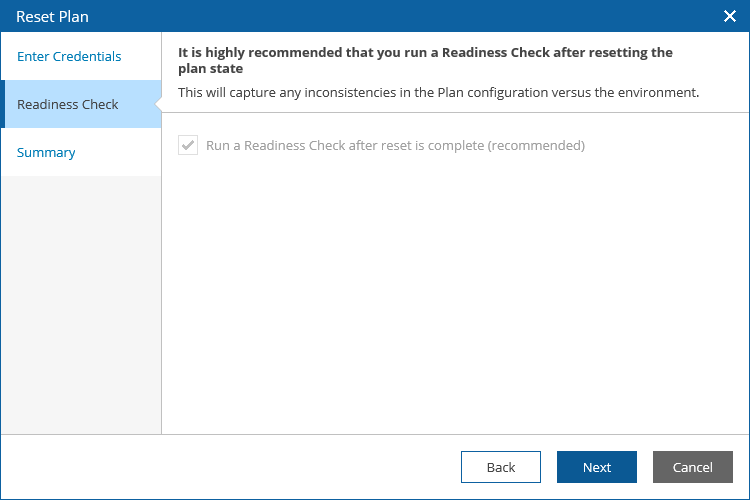After you run a storage plan and it acquires the FAILOVER state, you must reset the state of the plan if you are willing to run it again (for example, to perform failback). The Reset action returns the plan to the DISABLED state and updates the VAO database to reflect the changes made to the location of VMs included in the plan. The configuration of plan steps and their parameter settings in this case remain the same.
