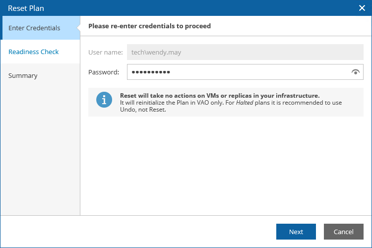 - For security purposes, at the Enter Credentials step, retype the VAO Administrator, Plan Author or Plan Operator password.