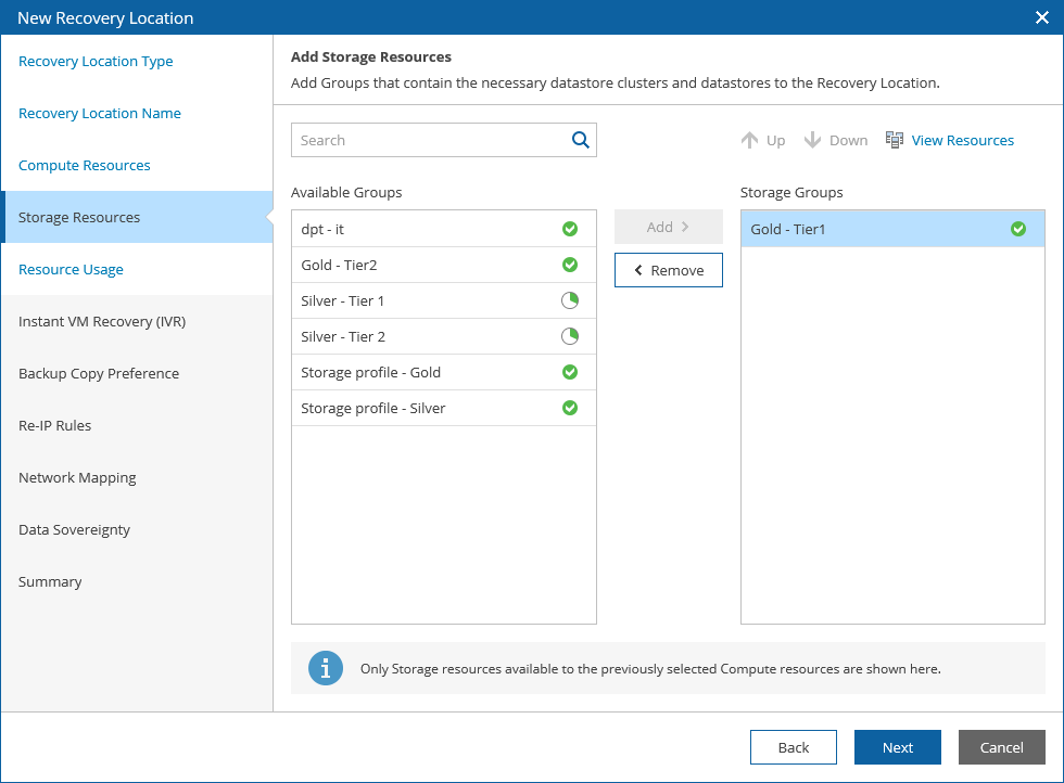 At the Storage Resources step of the wizard, specify destination datastores and datastore clusters where VM files must be stored. To do that, select the required resource groups in the list of available groups and click Add.