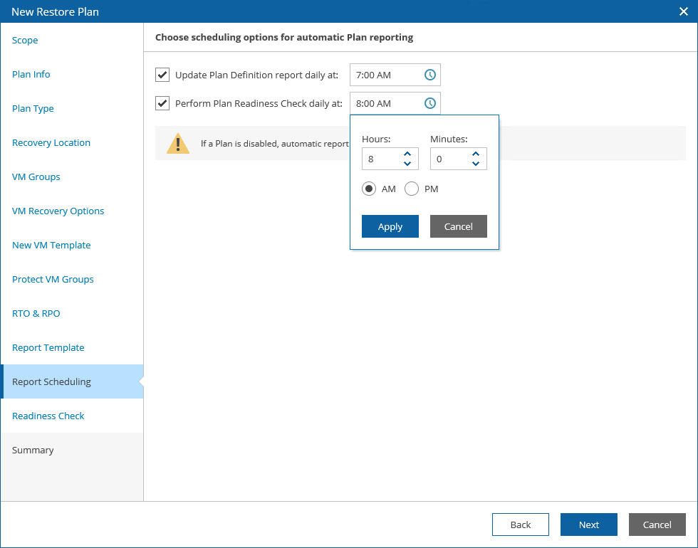 If you select the Update Plan Definition report daily at or Perform Plan Readiness Check daily at check box, you can specify the exact time at which the report must be generated. To do that, click the Schedule icon next to the check box, set the desired time, and click Apply.