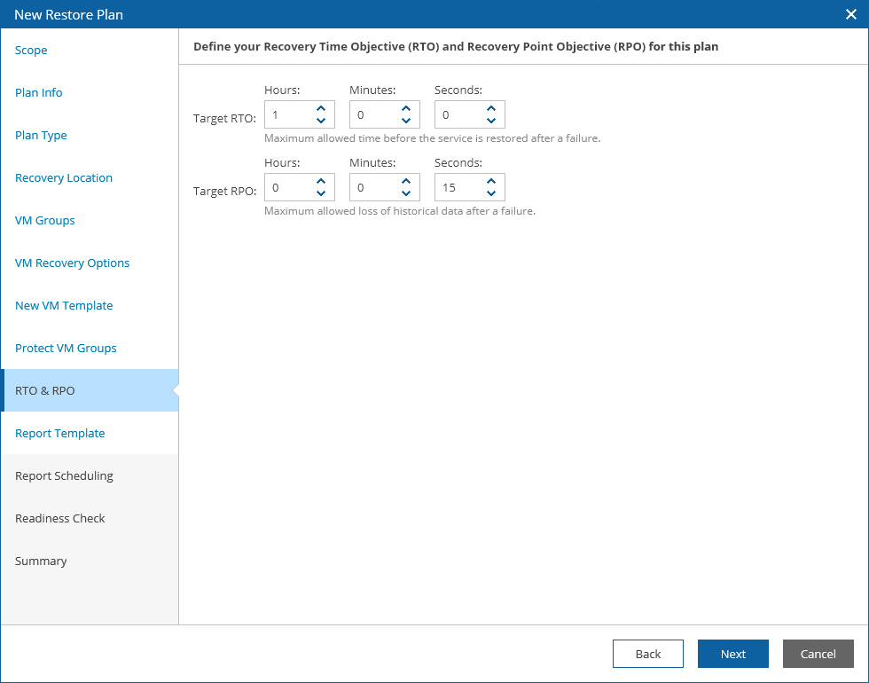 At the RTO & RPO step of the wizard, define your Recovery Time Objective (RTO) and Recovery Point Objective (RPO) for the plan: