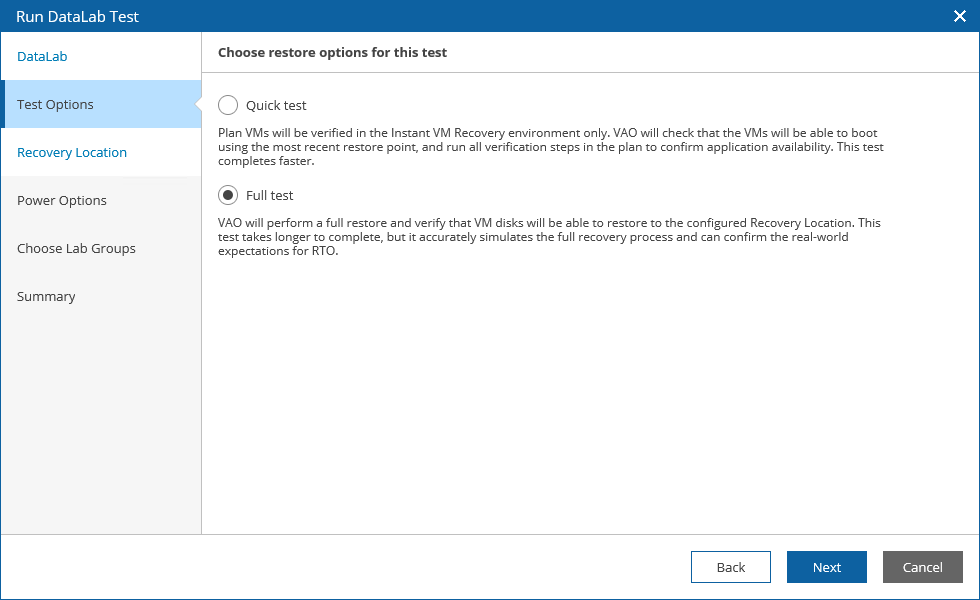- If you select the Full test option, VAO will not only verify that VM backups are ready-to-use, but also check that the recovery location to which the VMs will be restored is available and has enough resources to support the recovery process.