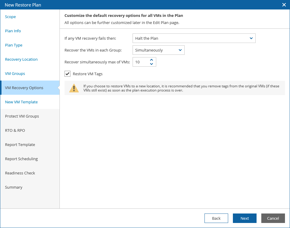 At the VM Recovery Options step of the wizard, use the If any VM recovery fails option to choose whether you want to proceed or halt plan execution in case VM recovery fails. VM criticality can also be customized later per-group when editing the plan.