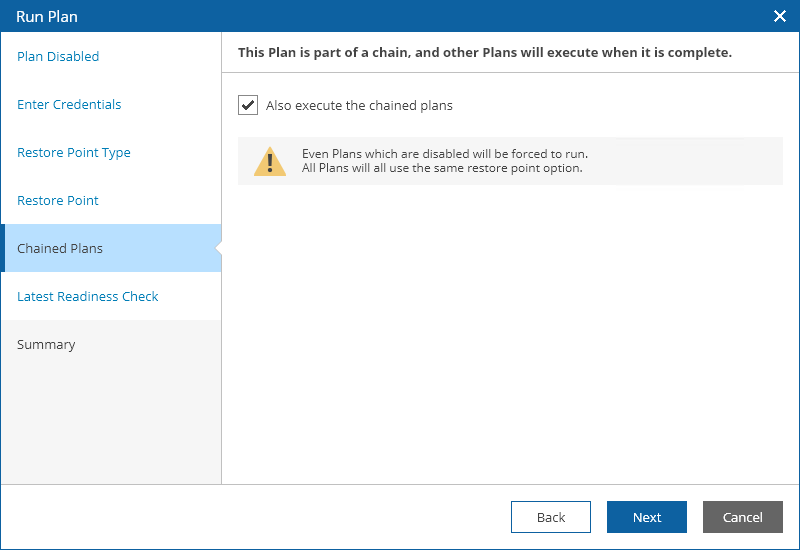 At the Chained Plans step, select the Also execute the chained plans check box to proceed to execution of subsequent plans after the current plan enters the FAILOVER state.
