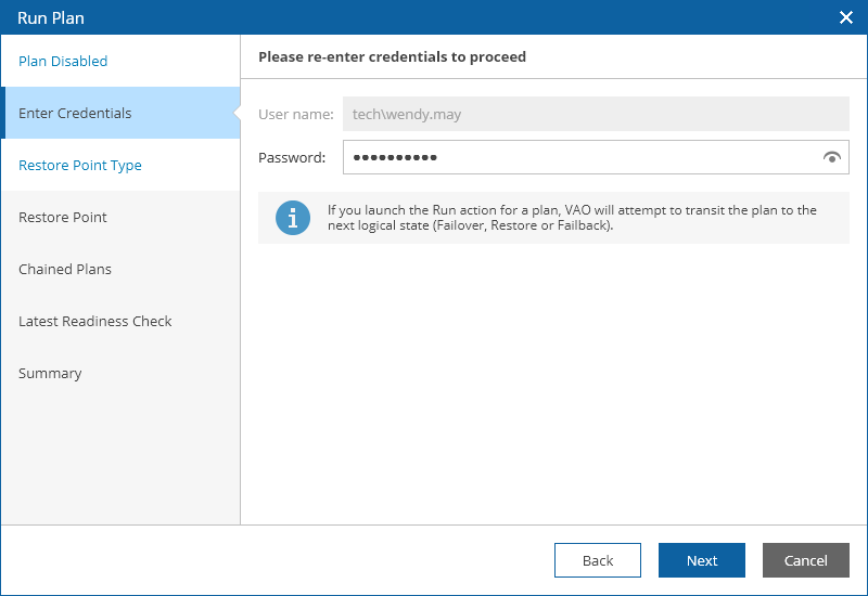 - For security purposes, at the Enter Credentials step, retype the VAO Administrator or Plan Operator password.