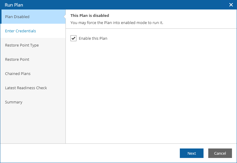At the Plan Disabled step, select the Enable this Plan check box to enable the plan. You will not be able to proceed with the wizard unless you select the check box.