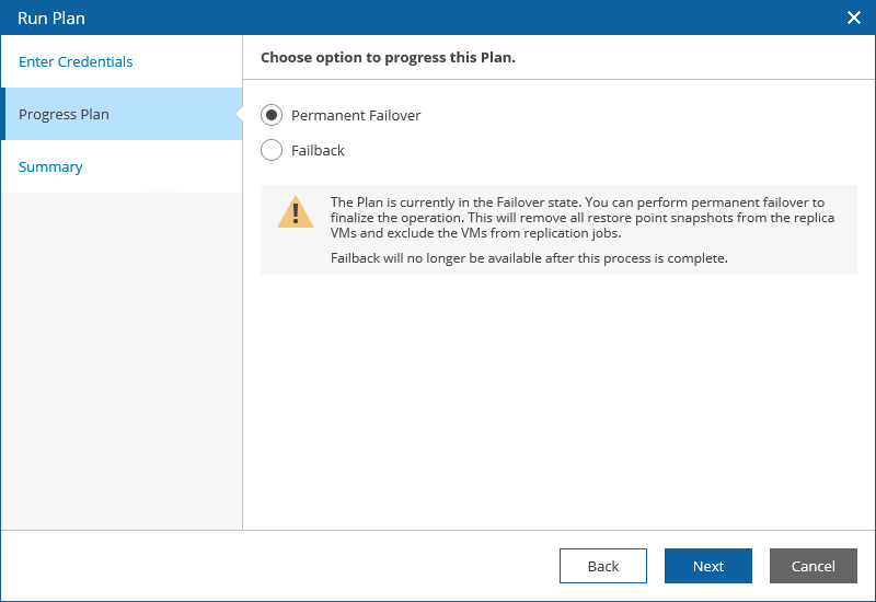 - At the Progress Plan step, select the Permanent Failover option.
