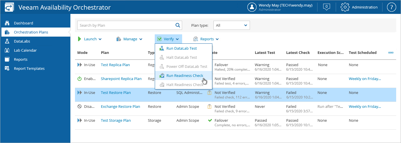 By default, VAO runs the readiness check automatically for every ENABLED orchestration plan at 8:00 AM daily. To run the check manually for a plan: