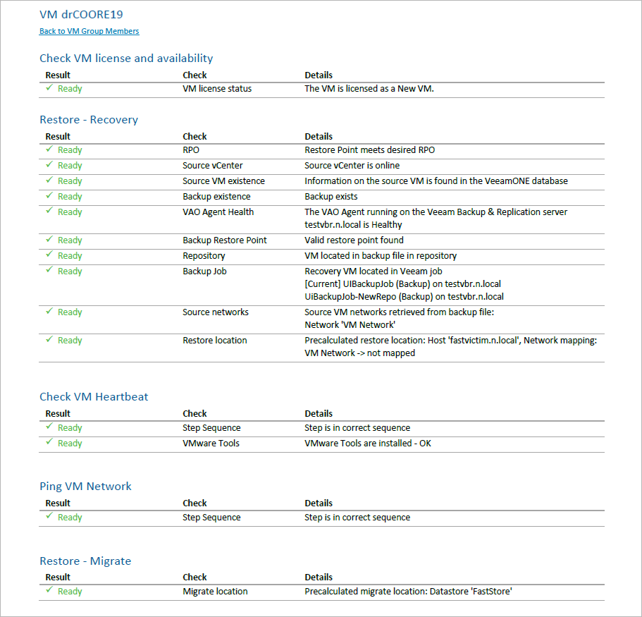 The Readiness Check Report will use the default report template or a custom template created earlier. After the template pages, the results of all readiness checks will be appended. The report will display a plan overview, summary of VM groups included in the plan, with drill-down hyperlinks to specific VMs and color-coded results of checking every plan step.