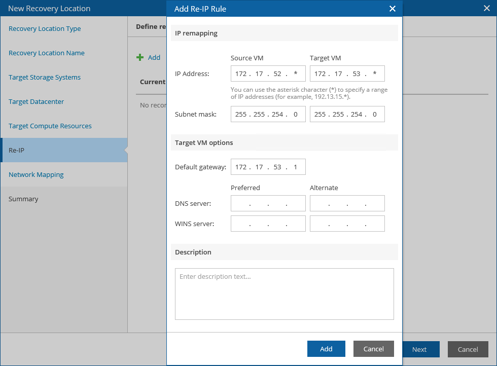 To configure a re-IP rule, at the Re-IP Rules step of the wizard, click Add. The Add Re-IP Rule window will open.