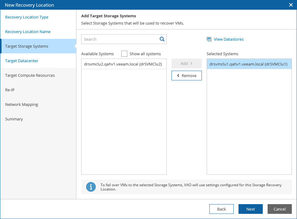 To display the full list of all available storage systems including storage systems used in other storage recovery locations, select the Show all systems check box.