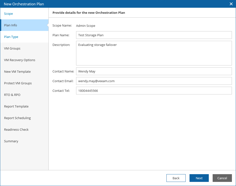 At the Plan Info step of the wizard, use the Plan Name and Description fields to enter a name for the new plan and to provide a description for future reference. The maximum length of the plan name is 64 characters; the following characters are not supported: * : / \ ? " < > | .