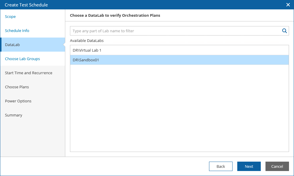 At the DataLab step of the wizard, select a DataLab that you want to use to verify orchestration plans.