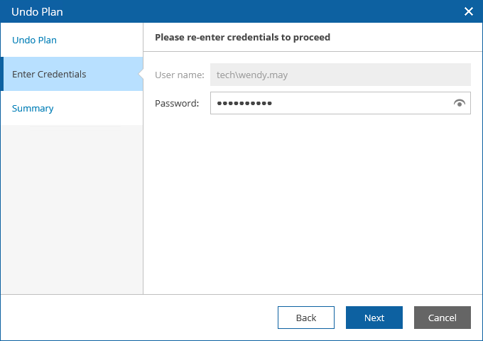 - For security purposes, at the Enter Credentials step, retype the VAO Administrator or Plan Operator password.