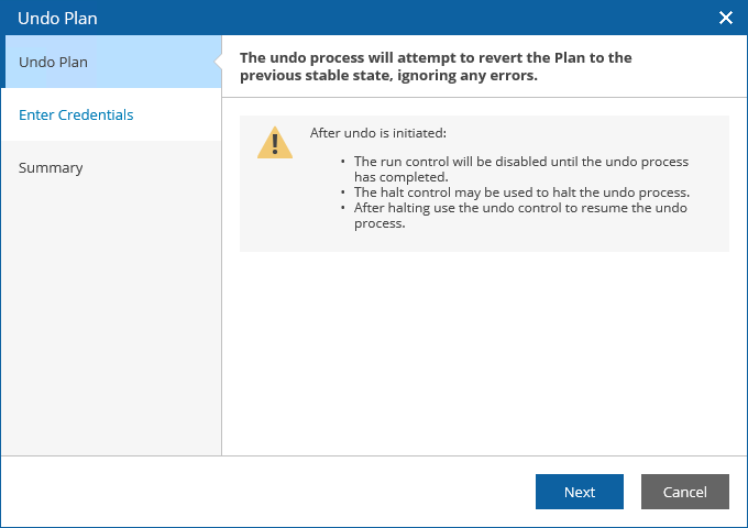 If the undo failback process encounters an error while being performed, it will not be halted automatically — the plan will proceed until the process completes. To terminate the undo failback process manually, use the Halt option to stop the currently running plan as described in section Halting Failover. To resume the undo failback process again, use the Undo option.