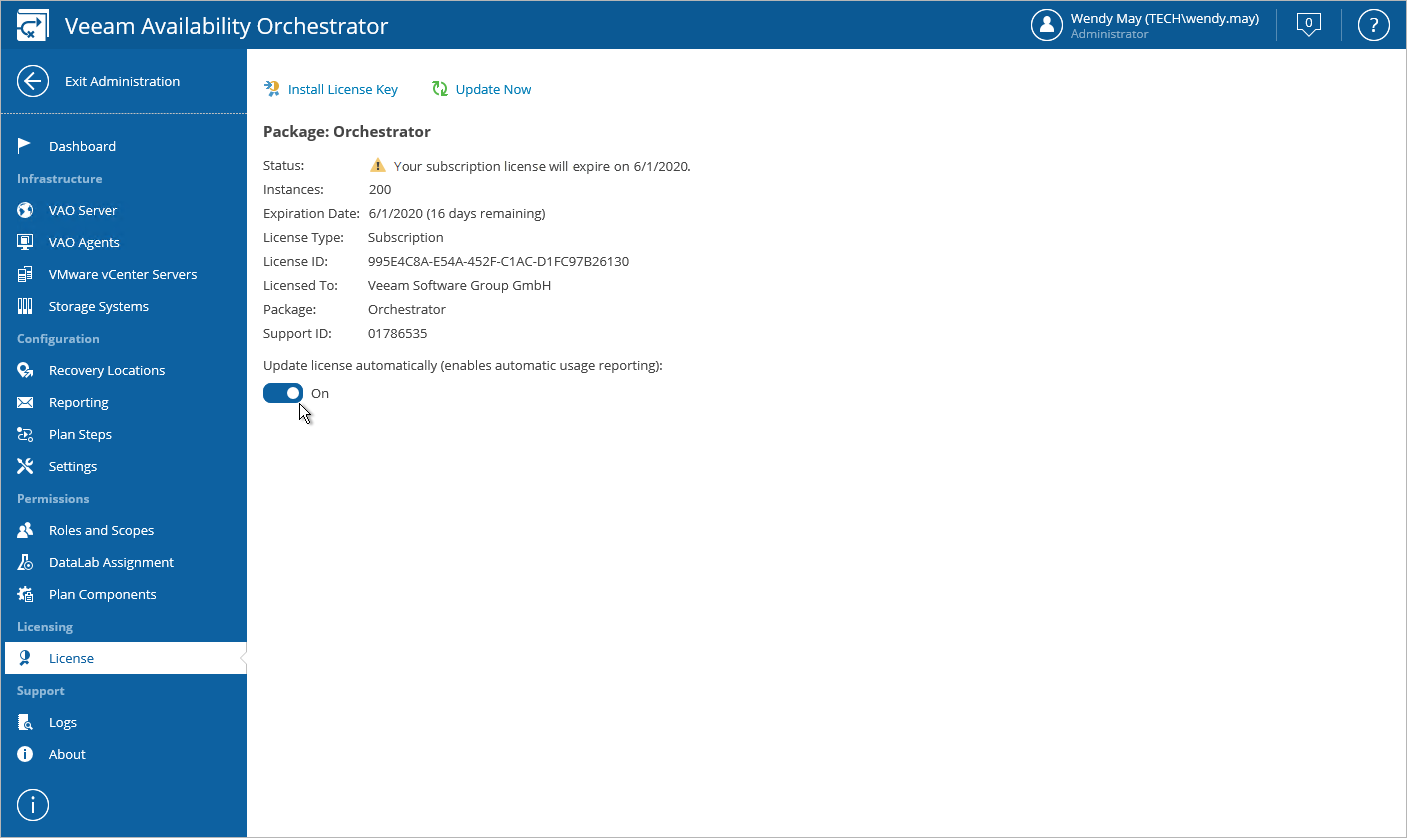 You can instruct VAO to update the license automatically. Automatic license update removes the need to perform license update manually every time it is about to expire. If automatic license update is enabled, VAO proactively communicates with the Veeam License Update Server to obtain and install a new license before the current license expires.