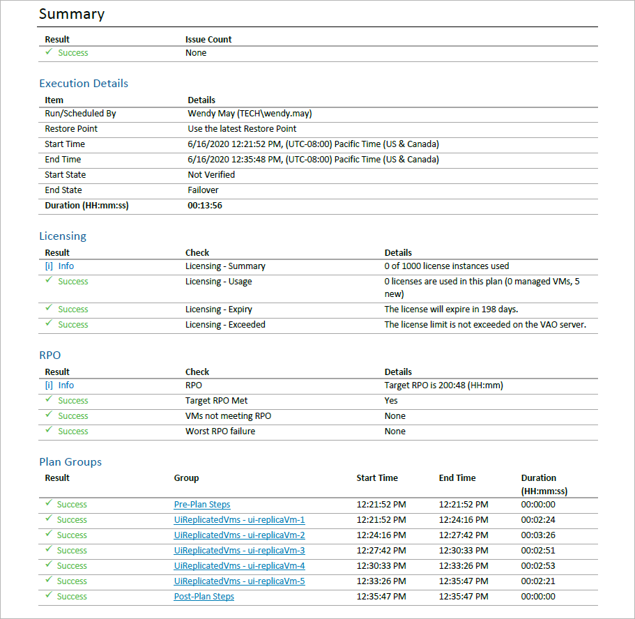 The Plan Execution Report will use the default report template or a custom template created earlier. After the template pages, the results of plan execution will be appended. The report will display a plan overview, summary of VM groups included in the plan, with drill-down hyperlinks to specific VMs and color-coded results of processing every plan step.