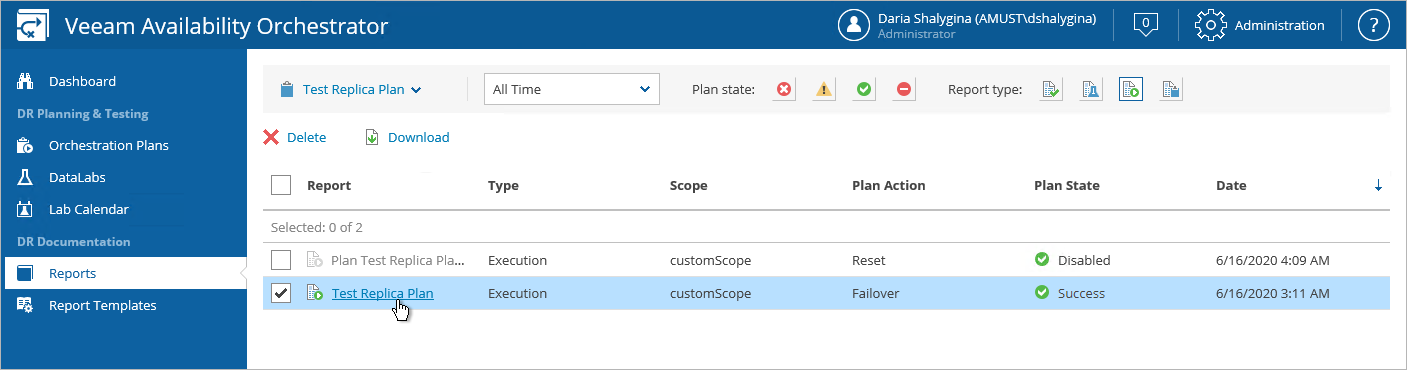 The Reports page will be displayed. The Show Execution reports option will be automatically enabled to list all available Plan Execution Reports for the plan.