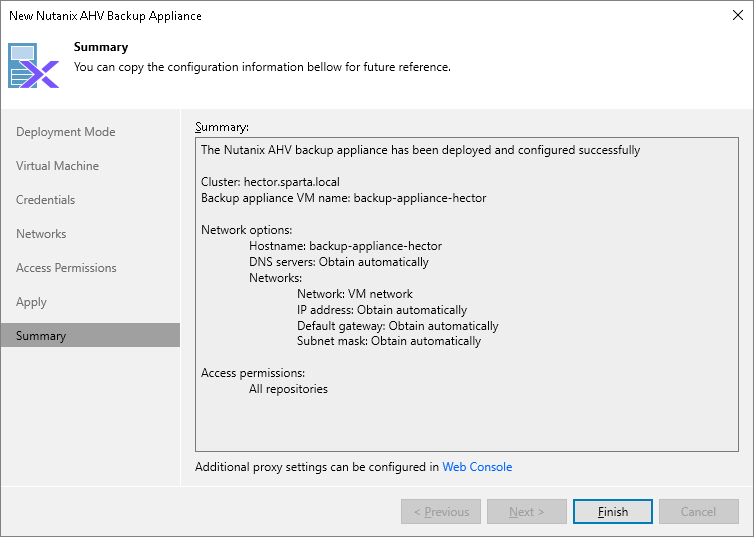 At the Summary step of the wizard, review summary information and click Finish. To open the Nutanix AHV backup appliance web console in your web browser, click Web Console.