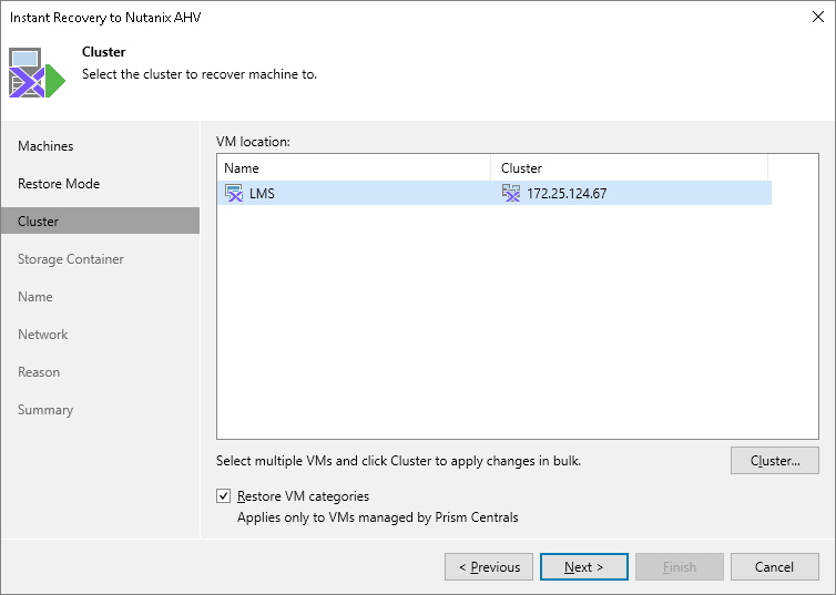 At the Cluster step of the wizard, choose the cluster to which the recovered VM will belong. In the Prism Central deployment, you can also choose whether you want the recovered VM to be assigned the same categories as the original VM.
