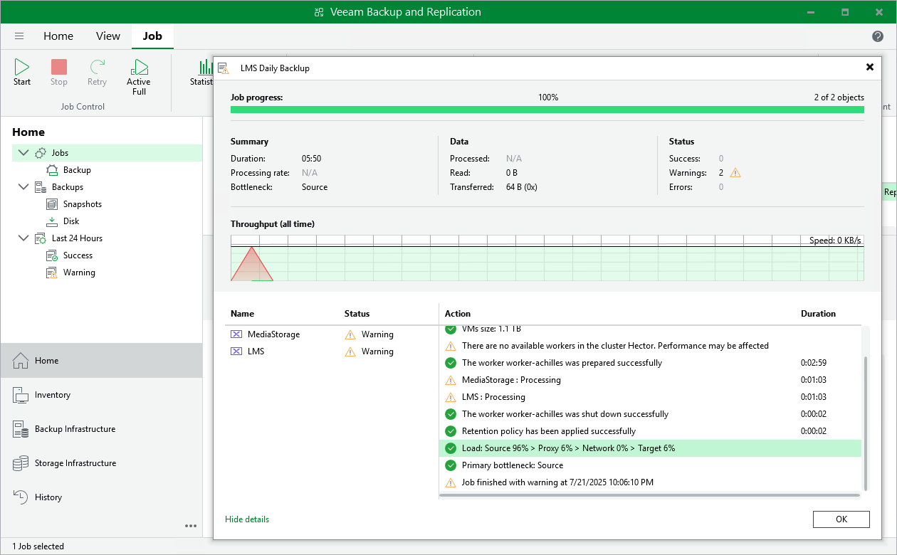 To learn how to analyze the bottleneck statistics, see Veeam Backup & Replication User Guide, section Performance Bottlenecks.