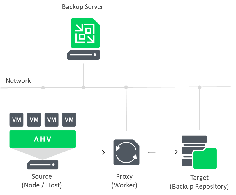 - Target — the gateway server component responsible for processing VM data, or the target disk writer component responsible for storing data in the backup repository.
