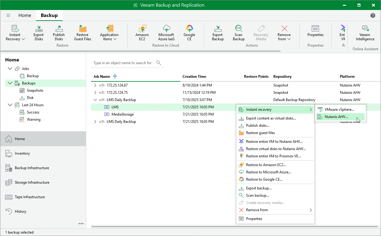 - In the working area, expand the necessary backup, select the VM that you want to restore and click Instant Recovery > Nutanix AHV on the ribbon, or right-click the VM and select Instant Recovery > Nutanix AHV.