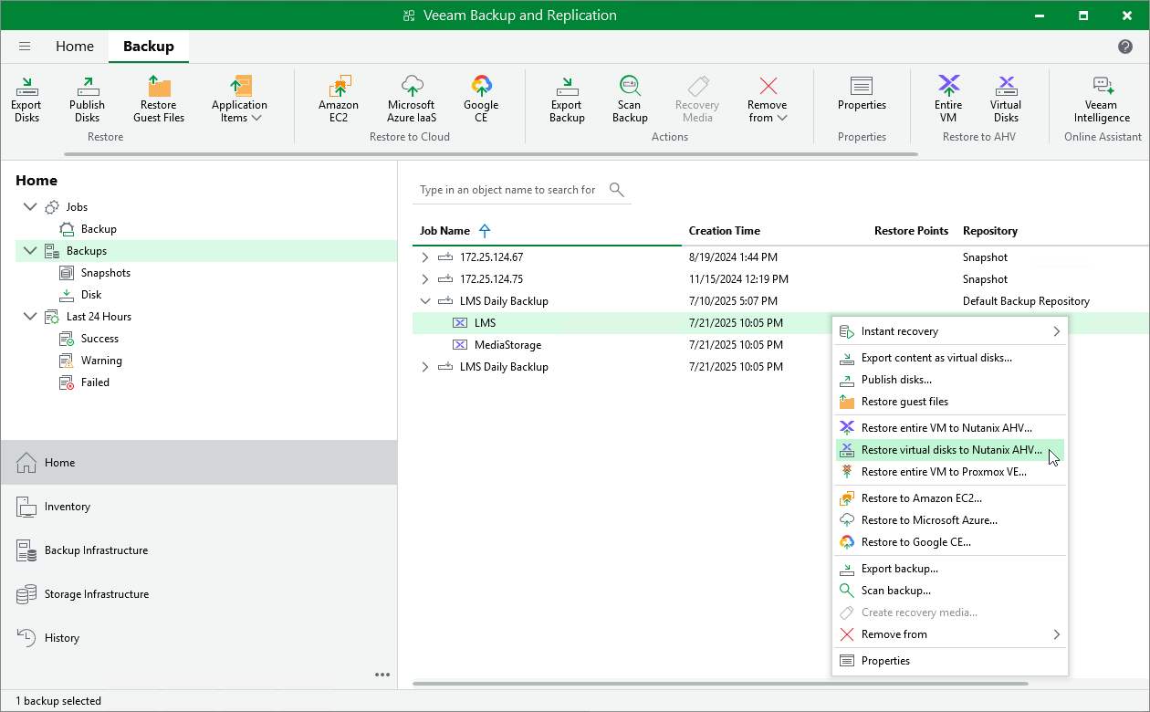 - In the working area, expand the necessary backup or snapshot job, select the VM that you want to restore and click Virtual Disks on the ribbon, or right-click the VM and select Restore virtual disks to Nutanix AHV.