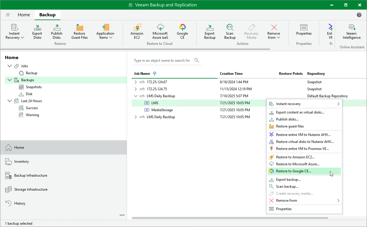 - In the working area, expand the necessary backup job, right-click the VM that you want to restore and select Restore to Google CE.