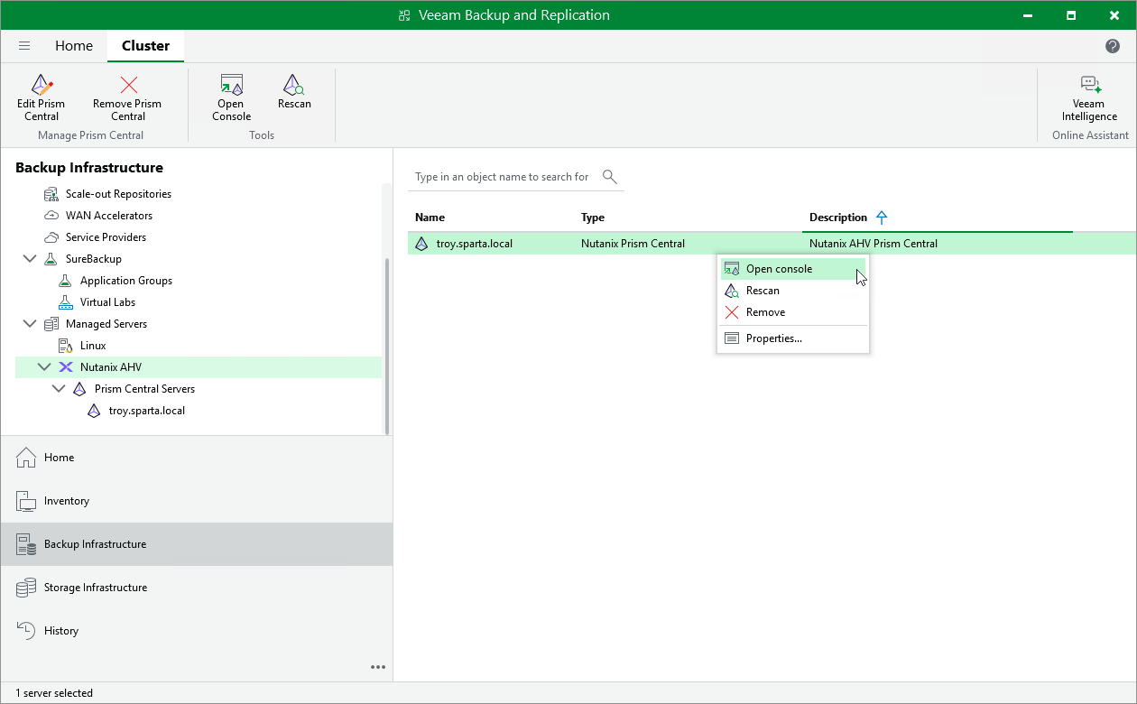 If you want to check the configuration of your Nutanix AHV infrastructure, you can use Veeam Backup & Replication to launch the Prism Central console or the Prism Element console.