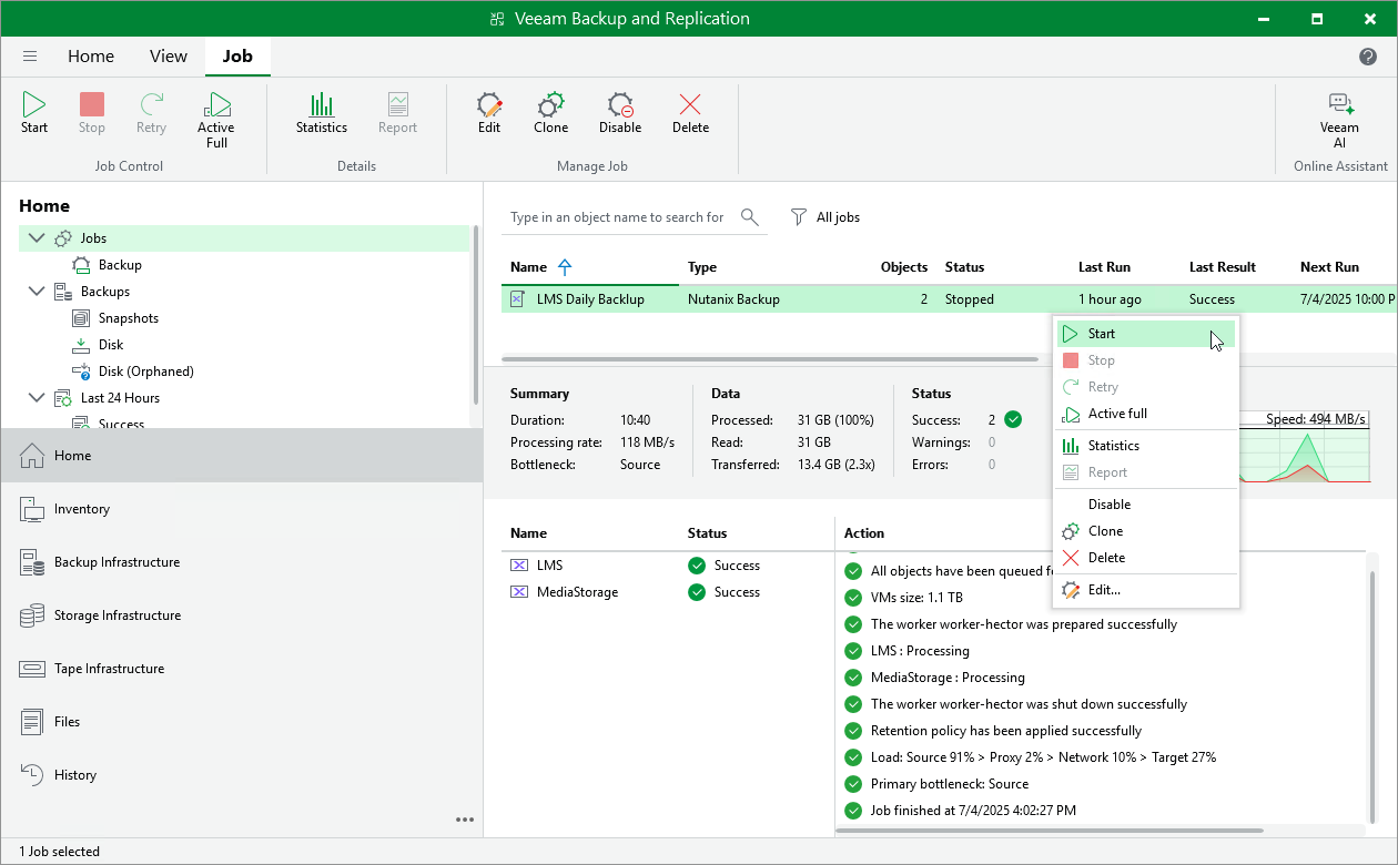 You can start a job manually, for example, if you want to create an additional restore point and do not want to modify the configured job schedule. You can also stop a job manually if processing of a VM is about to take too long, and you do not want the job to have an impact on the production environment during business hours. When you stop a running job, Veeam Backup & Replication creates a new restore point only for those VMs that have already been processed by the time you stop the job.