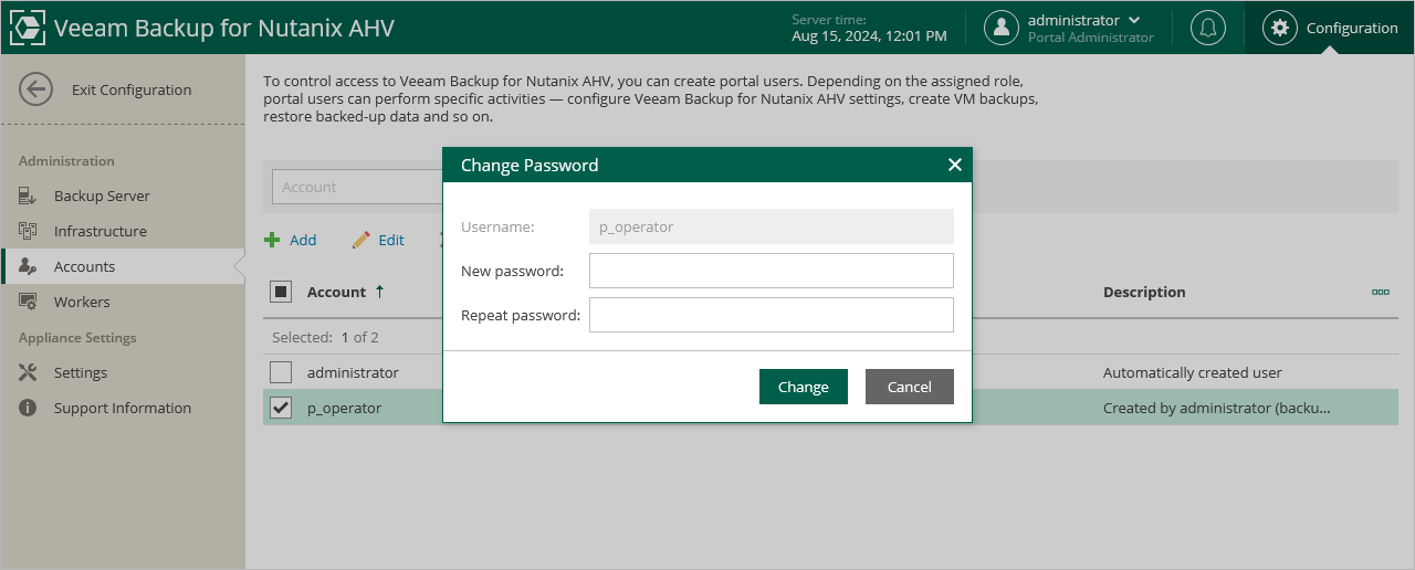 As an administrator, you can change the password for a Veeam Backup for Nutanix AHV user account:
