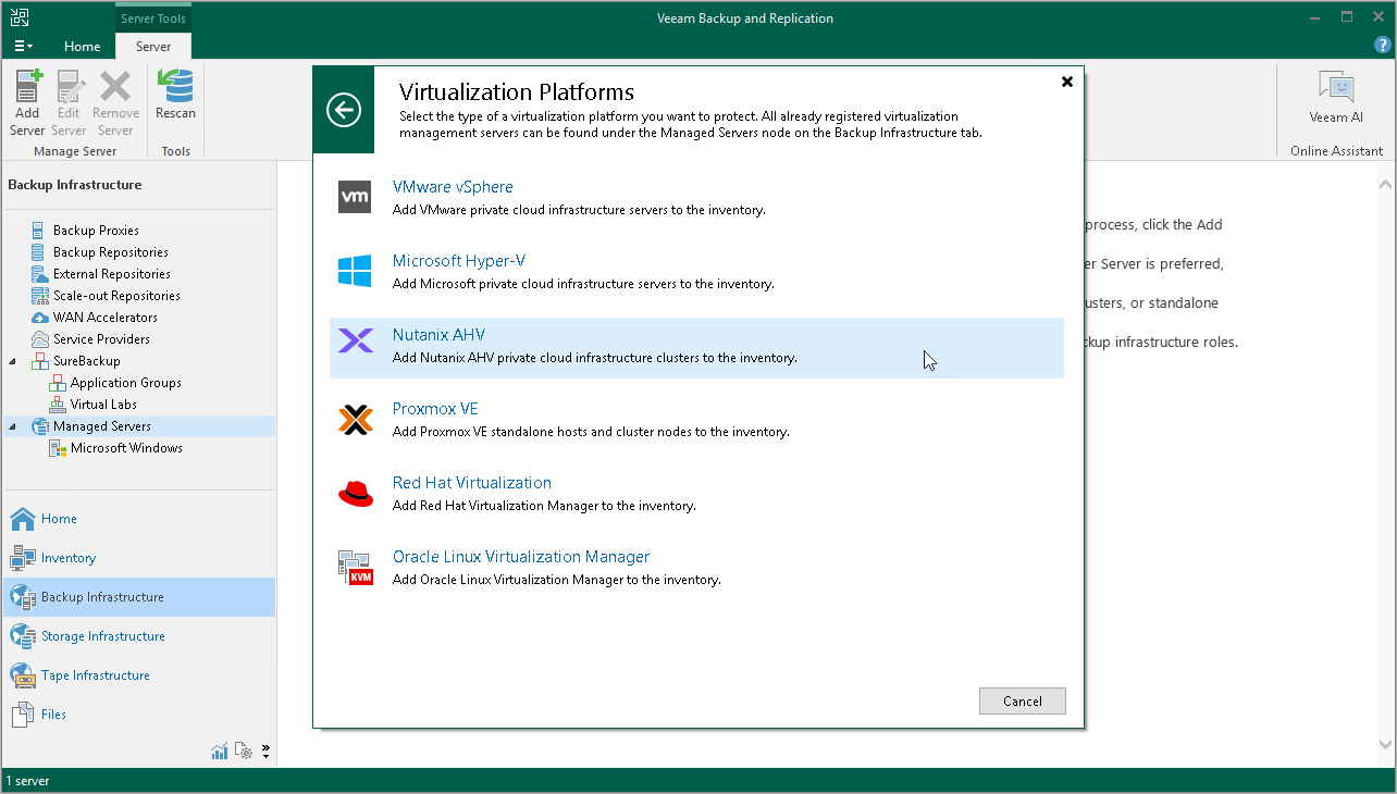 - In the Virtualization Platforms window,select Nutanix AHV to launch the New Nutanix AHV Server wizard.