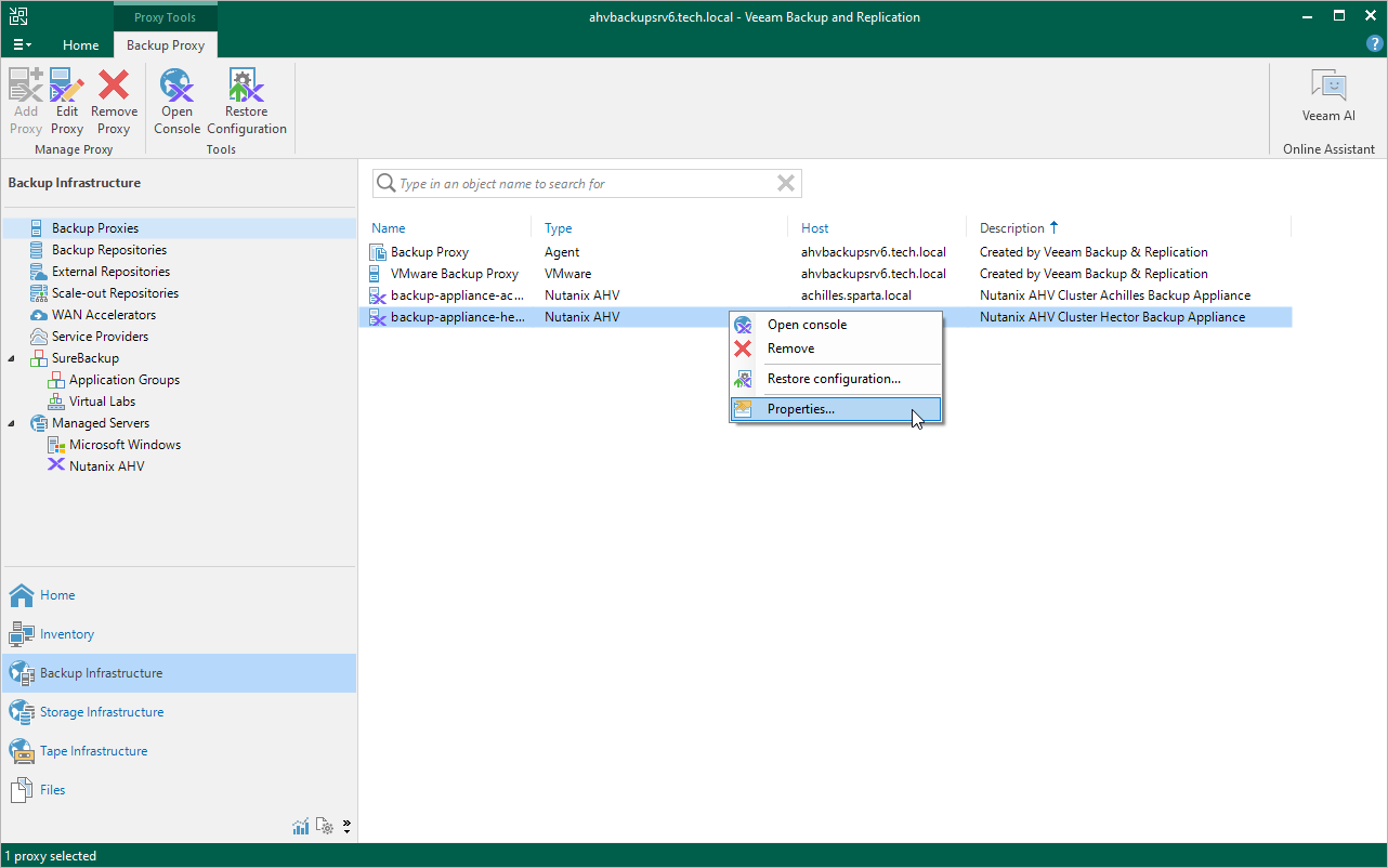 - In the working area, select the Nutanix AHV backup appliance and click Edit Proxy on the ribbon, or right-click the Nutanix AHV backup appliance and select Properties.