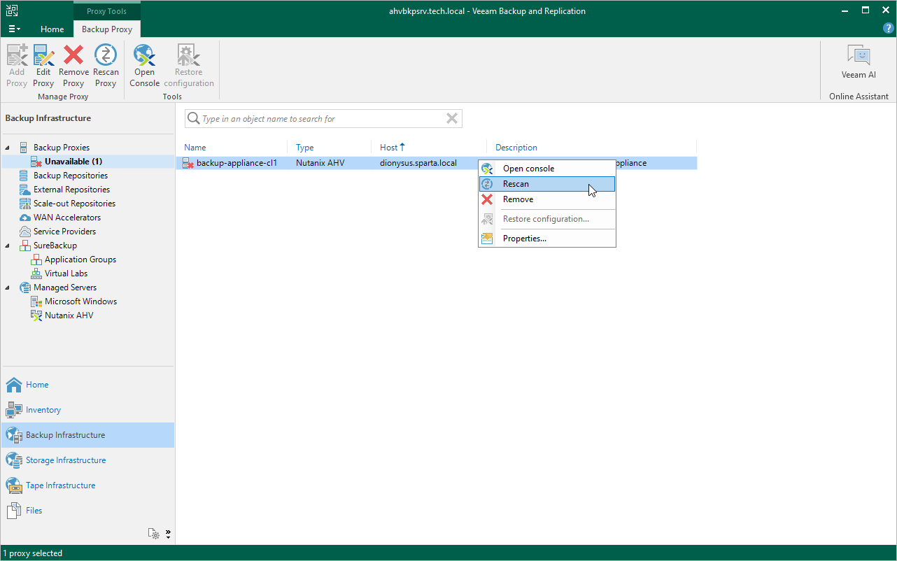3. In the working area, select the Nutanix AHV backup appliance and click Rescan Proxy on the ribbon, or right-click the Nutanix AHV backup appliance and select Rescan.