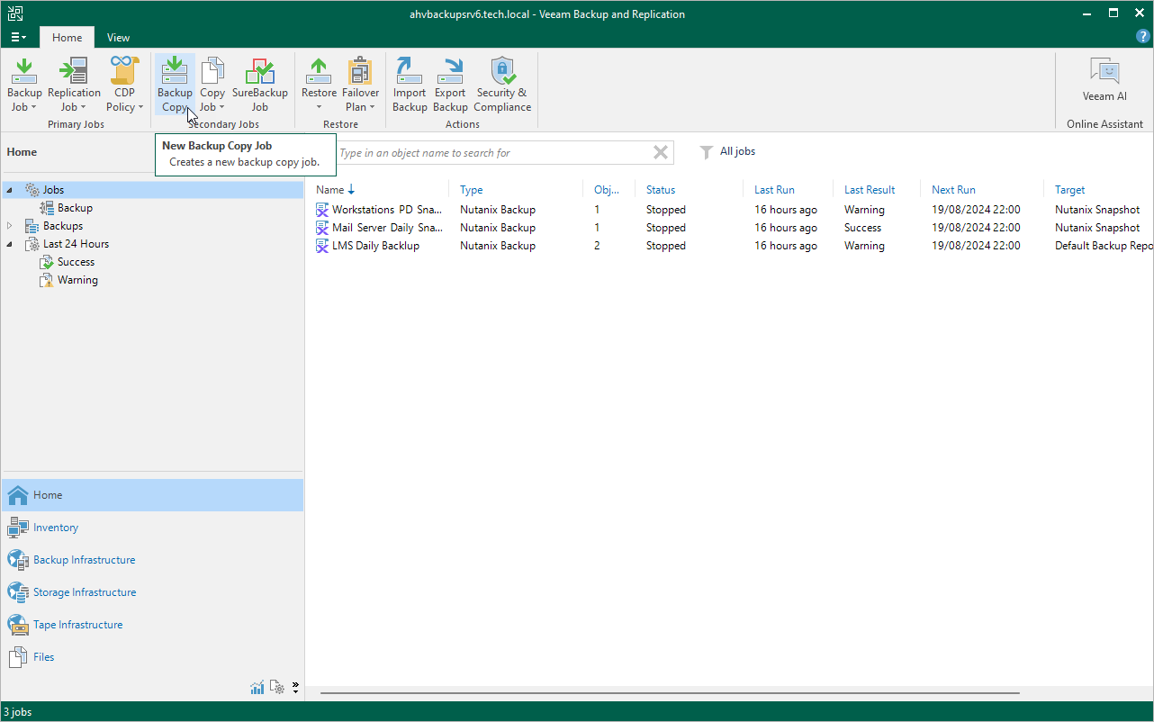 - In the inventory pane, select Jobs and click Backup Copy on the ribbon.