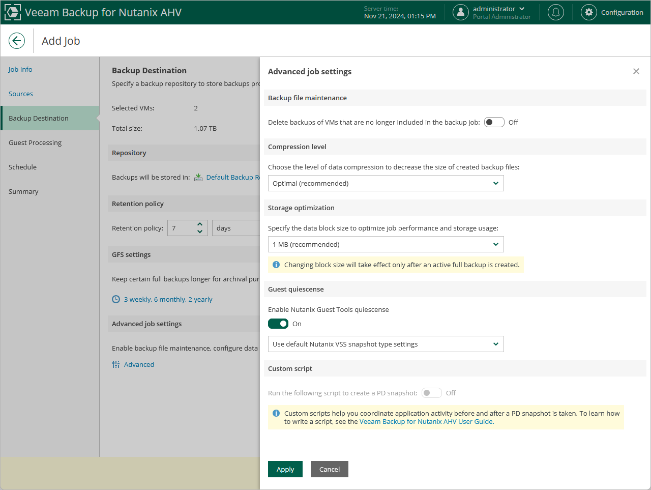 When running custom scripts, Veeam Backup for Nutanix AHV uses native Nutanix AHV capabilities to take PD snapshots. If Nutanix AHV fails to create a PD snapshot, the backup job will also fail to complete successfully. For more information on the prerequisites for creating PD snapshots, see Snapshot Types. |