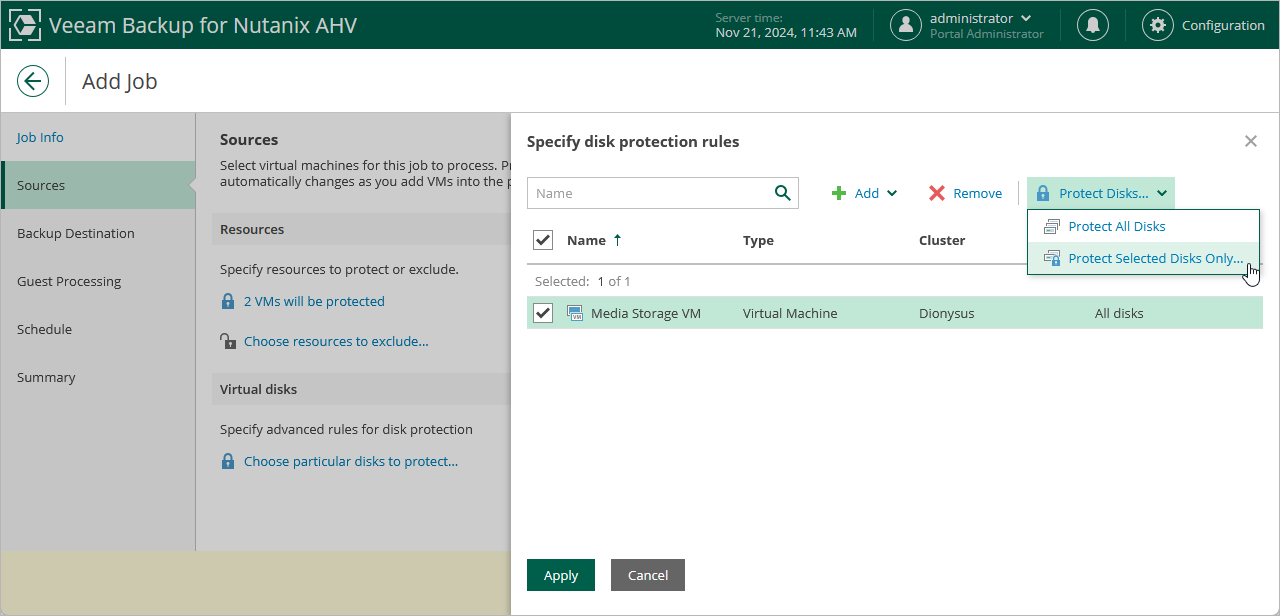 In the Virtual disks section of the Sources step of the wizard, you can instruct Veeam Backup for Nutanix AHV to back up only specific virtual disks and volume groups related to the specified backup scope: