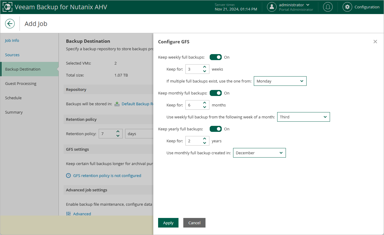 After you configure the GFS retention policy settings, schedule active full or synthetic full backups. Otherwise, no new full backups will be automatically produced, and Veeam Backup for Nutanix AHV will be unable to leverage them for long-term retentions.