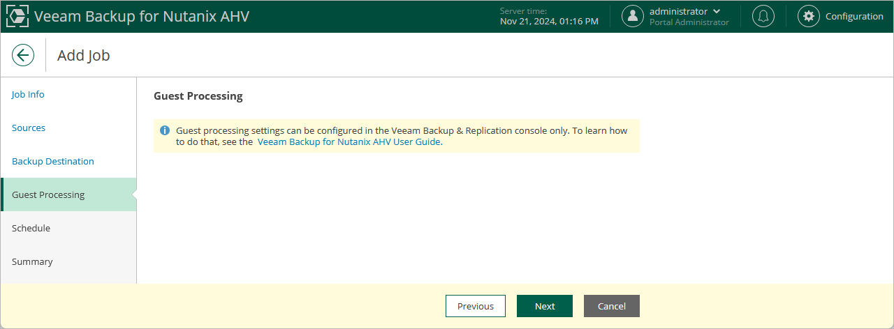If you want to create transactionally consistent backups that will guarantee proper recovery of VM applications, you must enable application-aware processing. However, guest processing settings are not available in the web console. That is why you can skip the Guest Processing step, complete the Add Job wizard — and then edit the job settings in the Veeam Backup & Replication console to enable application-aware processing as described in section Configuring Guest Processing Options.