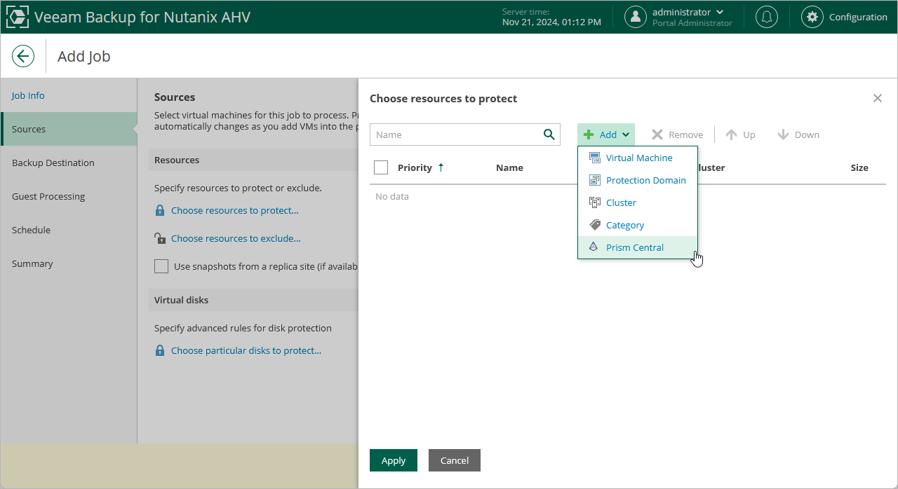 In the Resources section of at the Sources step of the wizard, specify the backup scope — resources that Veeam Backup for Nutanix AHV will back up: